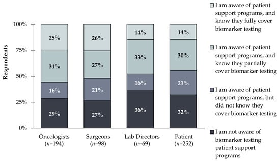 Oncologists, surgeons, lab directors, and patients (n = 613) were asked the following questions: Which of the following best describes your level of awareness of patient support programs for biomarker testing? A large amount of all respondents reported not being aware of biomarker testing patient support programs (29% of oncologists, 27% of surgeons, 26% of lab directors, and 32% of patients).