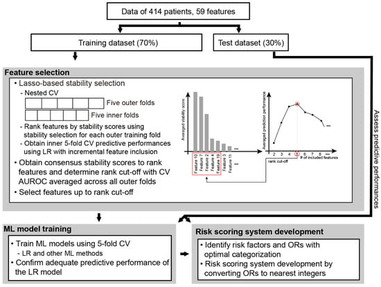 The features were selected using stability selection, a LASSO-based method implemented in the R stabs (version 0.6-4) package in nested cross-validation (Figure 1) [17]. In brief, this method assesses the stability scores for each feature, quantified as the frequency of inclusion among the bootstrapped subsamples. This metric indicates the robustness of each feature selection from the given random sampling variations. For each outer training fold, the features were ranked in order of decreasing stability score. The logistic regression models were then evaluated from the fivefold inner cross-validated predictive performance by incrementally adding top-ranking features. After all of the iterations across the outer folds, consensus stability scores were obtained for all of the features by pooling all of the stability scores. The optimal number of features was then determined as the minimum number of features associated with the maximum averaged cross-validated predictive performance. Then, the features with consensus stability scores up to the optimal number rank were selected. These features were then further filtered using multivariable logistic regression to select only the significant features (p-value < 0.1).
