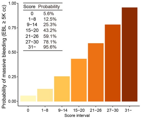 We developed risk-scoring systems to predict the probability of massive bleeding in order to maximize the clinical utility of the final logistic regression model. Firstly, an optimally categorized logistic regression model was derived and its adequate prediction performance was confirmed (AUROC—0.776; AUPR—0.760). We then derived a scoring system from the feature coefficients of the categorized model (Table 4) and mapped the scores with the probability of massive bleeding (EBL ≥ 5000 cc) (Figure 3). The risk-scoring system showed good prediction performance and calibration (AUROC—0.775; AUPR—0.753; Supplementary Figure S2), delineating a 17-fold difference in the probability of massive bleeding across the score intervals.