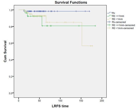 Survival curves for RX, R0 < 1 mm, and R0 > 1 mm groups. Kaplan–Meier curves show LRFS, DFS, and OS for patients with RX (blue solid), ‘R0 < 1 mm (green solid), and ‘R0 > 1 mm (yellow solid) resection; time units: months.