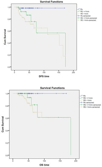 Overall, local recurrence was detected in 10 patients (6.6%), with no statistically significant difference in LRFS in the RX (N = 1; 1.7%), R0 < 1 mm (N = 3; 10.3%), and R0 > 1 mm (N = 6; 9.4%) groups of patients (p = 0.177); the corresponding DFS values were 96.6%, 79.3%, and 64.1%, respectively, with a statistically significant advantage in patients who developed a pCR after NAC (p = 0.002). Moreover, OS was significantly improved (p = 0.010) in patients with pCR; OS was 100% in the RX group, 86.2% in the R0 < 1 mm group, and 82.8% in the R0 > 1 mm group of patients; survival curves are reported in Figure 1.