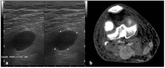 Lymphadenopathy of the right popliteal fossa from cutaneous melanoma of the calf. The B-Mode US scan (a) shows an oval, heterogeneous, predominantly hypoechoic lymph node with sharp margins. The contrast-enhanced CT axial-scan image (b) demonstrates a partially necrotic lymphadenopathy with peripheral enhancement.