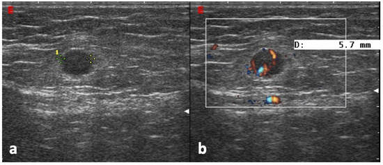 Regarding the evaluation of the internal echostructure, a typical finding is that a metastatic lymph node has a markedly and diffusely hypoechoic echo texture (Figure 1, Figure 2 and Figure 3) [14]. However, some authors considered the importance of the examination of cortical morphological abnormalities, as they may indicate an early stage of lymph node metastasis, possibly preceding the other typical features [14]. In this regard, it is well known that cancer cells transmitted by lymphatic vessels reach and grow first within the cortex and then in the rest of the lymph node [31]. Consequently, cortical thickening, which can be circumferential (symmetric), unilateral (asymmetric), or focal (possibly nodular), may representant an early finding [31]. Unilateral cortical thickening should be considered much more suspicious than circumferential thickening, while nodular thickening should be clearly interpreted as metastatic [31]. Nodular thickening, also called a “nodule within the node”, can be isoechoic or hypoechoic to the rest of the cortex; in both cases, it indicates a metastatic localization [14,31]. Moreover, another suspicious cortical abnormality may be a focal bulging or protuberance [31].