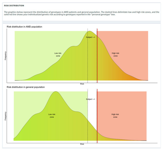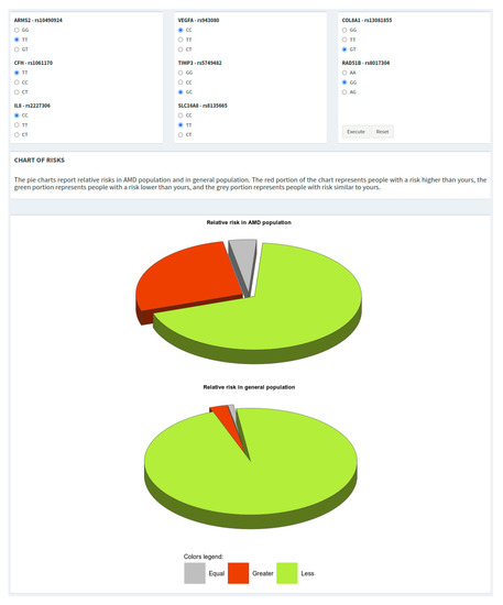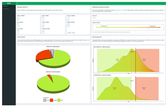 The tool can rely on a computational system that has been thought to reduce the gap between genetic data and clinical practice. Indeed, it represents a user-friendly and rapid means to provide an individual risk profile for wet AMD, which can be exploited to promote preventive actions and personalized programs for affected patients or at-risk individuals. In fact, WARE allows the assessment of the genetic load associated with wet AMD risk at the individual level and compare it with the average risk observed in the other patients as well as in the general population. In this way, clinicians are able to evaluate if the patient displays particular genetic features that may suggest the need of provide the patient with a personalized approach based on his or her genetic make-up and non-genetic factors.