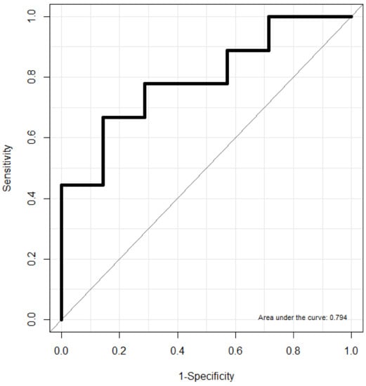 Multiple linear regression analysis was carried out with cognitive function (MMSE score) as the dependent variable, and BMI, sleep efficiency, and AI as the independent variables, after analysis of covariance. BMI and sleep efficiency were positively related to normal cognitive function, whereas high AI was associated with reduced cognitive function (Table 3). In the binary logistic regression analysis, BMI, sleep efficiency, and AI were significantly associated with cognitive function (odds ratio [OR] = 0.746, 95% confidence interval [CI] = 0.598–0.892; OR = 1.965, 95% CI = 1.007–2.360; OR = 2.028, 95% CI = 1.076–3.531, respectively) (Table 4). AI showed the strongest relationship with cognitive function. In the ROC curve analyses, the area under the ROC curve for the prediction of cognitive impairment using BMI, sleep efficiency, and AI was 0.794, with a sensitivity of 66.7% and specificity of 85.7% (Figure 1).