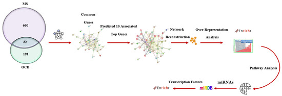 As a first step, all genes associated with both MS and OCD are listed (Supplementary Tables S1 and S2). Next, shared genes with the highest topological features were extracted. Then, to find out the genes that have significant interaction with 32 shared genes, the STRING database was used. Since these genes have strong connections with common genes, it is suggested that molecular underpinnings, protein–protein interactions, and cellular changes of novel genes can give us new insights into pathological features between MS and OCD. To this point, further steps of analysis were performed on 10 genes that have close connections with shared genes. To identify protein–protein interactions, target genes were uploaded into the STRING database (https://string-db.org/ (accessed on 24 December 2021)). Target genes were uploaded into Cytoscape to predict all functional interactions and to obtain the main network of topological features. To find out pathways in target genes, WikiPathways analysis was used. We also used Enricher to analyze the consequences of target genes on cell type and brain region. Finally, a link between the pathological processes of MS and OCD is recognized at the transcriptional and miRNA levels. These analyses help us to identify similar genetic and biological features between MS and OCD and give some cues to comprehend significant pathological mechanisms (Figure 1).