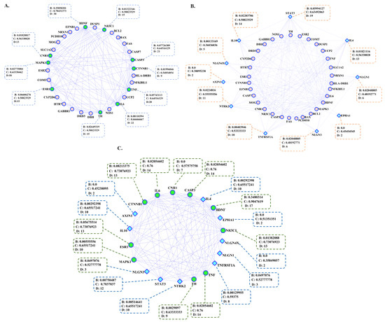 Reconstructed genetic networks for MS and OCD. (A) Genetic network for MS-OCD shared genes. The current network is comprised of 32 nodes (genes) and 121 edges (interactions). Green nodes represent genes with greater network features (hub genes in the network; network parameters: density = 0.254, diameter = 5, centralization = 0.513, clustering coefficient = 0.583). (B) Genetic network for common and ten top genes between MS and OCD. Circular pink nodes represent shared genes and external blue diamond nodes represent novel predicted genes for MS and OCD (network parameters: density = 0.239, diameter = 5, centralization = 0.537, clustering coefficient = 0.662). (C) Genetic networks for 10 genes with higher topological features between MS and OCD shared genes (green nodes) and 10 novel predicted genes (blue nodes) (network parameters: density = 0.489, diameter = 4, centralization = 0.450, clustering coefficient = 0.836). B: betweenness centrality; C: closeness centrality; D: degree.
