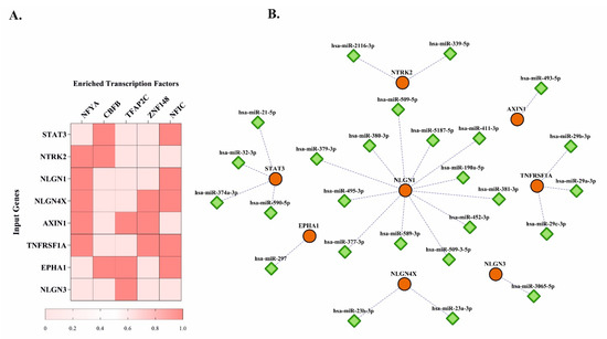 Our human transcription factor analysis predicted five significant transcription factors including nuclear transcription factor Y subunit alpha (NFYA) (predicted by NTRK2, NLGN1, NLGN4X, AXIN1, and TFNRSF1A genes), core-binding factor subunit beta (CBFB) (predicted by STAT3, NTRK2, and EPHA1 genes), transcription factor AP-2 gamma (TFAP2C) (predicted by AXIN1, EPHA1, and NLGN3 genes), zinc finger protein 148 (ZNF148) (predicted by NLGN4X, AXIN1, and TFNRSF1A genes), and nuclear factor 1 C-type (NFIC) (predicted by STAT3, NLGN1, NLGN4X, TFNRSF1A, and EPHA1 genes) for target genes (Figure 3A). Importantly, we predicted 26 significant miRNAs with a target prediction score of greater than 90 percent for MS-OCD-associated novel genes (Figure 3B).