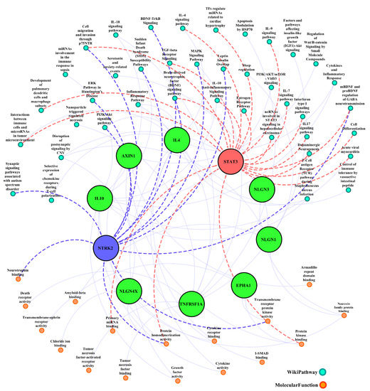 As shown in Figure 4, enrichment parameters including molecular function and pathways were predicted for ten hub genes that had the highest connections with common genes. Among them, STAT3 and NTRK2 had the maximum enrichment parameters in terms of molecular function and pathways. In molecular function variables, protein homodimerization activity was predicted for STAT3 and NTRK2. However, protein kinase binding and primary miRNA binding were predicted for STAT3. Transmembrane receptor protein kinase activity and neurotrophin binding were predicted for NTRK2 in terms of molecular function.