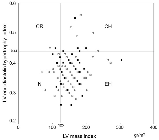 Distribution of left ventricular (LV) geometry in the whole population. The majority of patients is positioned in the LV eccentric hypertrophy quadrant (75%). The absence of a relation between LV geometry and LA compliance can also be appreciated (empty squares: normal LA compliance; filled squares: reduced LA compliance). CH: concentric hypertrophy; CR: concentric remodeling; EH: eccentric hypertrophy; LA: left atrial; N: normal.
