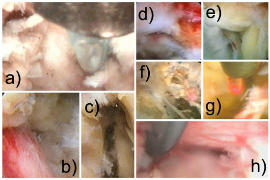 Examples of directly visualized pain generators identified with the spinal endoscope that are often missed by routine lumbar MRI scans include herniated or inflamed disc herniation (a), an inflamed nerve (b), a superior foraminal facet osteophyte, a vacuum disc with delaminated devitalized disc tissue (c), a hypertrophied superior articular process (SAP) with a facet cysts and tender capsule, an impacting facet margin (d), a furcal nerve (e), a tethered nerve root with contracted scar tissue from the pars inter-articularis (f), a hypervascular scar on the exiting nerve root (g), and a hypervascular in-flamed traversing nerve root (h).