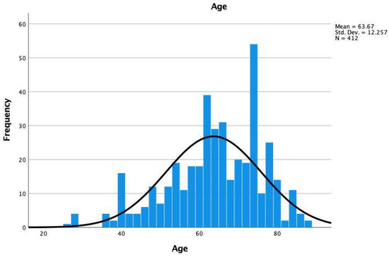 Histogram of the age distribution of the 412 study patients with a mean age of 63.67 ranging from 26 to 88 years with a standard deviation of 12.257 years.