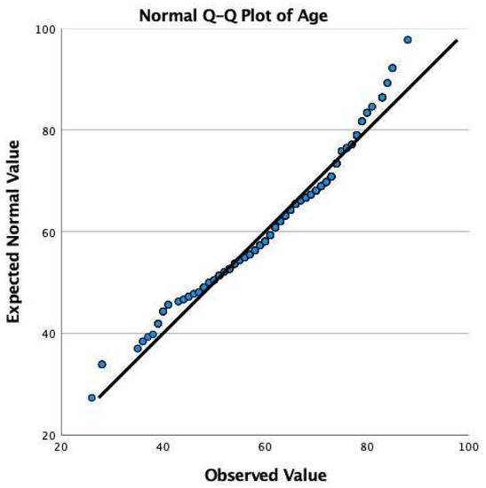 Q-Q Plot of expected versus observed values of age confirming the normal distribution of the 412 study patients’ age.