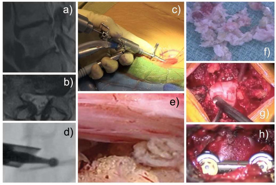 Laminectomy patients underwent a traditional open midline incision with subperiosteal dissection of the paraspinal muscles (Figure 4g) [72]. TLIF patients underwent minimally invasive fusion surgery using widely accepted surgical techniques employing a tubular retractor system, four pedicle screws, and at least one interbody fusion cage (Figure 4h) [70,71,72,73,74,75,76,77,78,79,80,81,82,83,84,85]. Pain generators could generally not be directly visualized reliably due to bleeding and lack of constant irrigation. Most patients mobilized rapidly and did not require postoperative rehabilitation. Postsurgical dorsal root ganglion inflammation caused dysesthesia in some patients [86]. If present, it was treated with non-steroidal anti-inflammatories, gabapentin or pregabalin, and transforaminal epidural steroid injections.