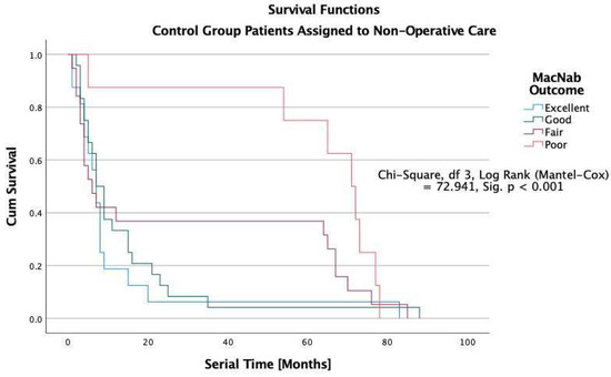 The Kaplan-Meier survival analysis showed that all study patients’ overall median durability of the lumbar decompression surgery was 38 months (Figure 5). In patients with excellent Macnab outcomes, the estimated median durability was 62 months in ELD, 43 in TLIF, and 31 months in laminectomy patients with excellent Macnab outcomes (p < 0.001; Figure 5, Figure 6, Figure 7 and Figure 8). In the control group patients, the median survival time was only seven months in patients with excellent and good outcomes because these patients crossed over to one of the surgical treatment arms. Control patients with fair Macnab outcomes were treated with spinal injections and had a median survival time of 6 months. Control patients with poor Macnab outcomes went largely untreated and had a mean survival time of 71 months until they were lost in follow-up.