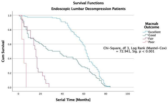 Kaplan-Meier (K-M) Survival functions by Macnab outcomes graphically illustrate the durability of ELD surgery. Patients were censored if they required additional treatment after their index operation or if their outcome was not known at their final follow-up. The estimated median (50% percentile) overall durability (survival) among ELD patients (n = 206) was 54 months with a standard error of 2.392, a lower boundary of 49.311, and an upper boundary of 58.689 months. The survival time in ELD patients with Excellent Macnab outcomes was 62 months with a standard error of 0.982, a lower boundary of 60.076, and an upper boundary of 63.924 months (Table 4).