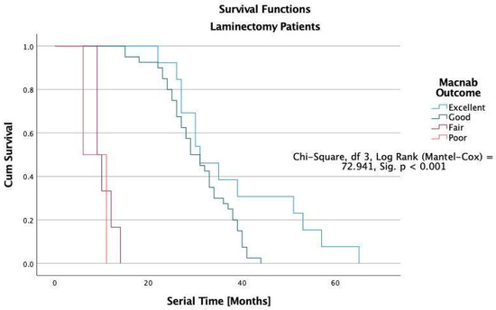 Kaplan-Meier (K-M) Survival functions by Macnab outcomes graphically illustrate the durability of laminectomy surgery. Patients were censored if they required additional treatment after their index operation or if their outcome was not known at their final follow-up. The estimated median (50% percentile) overall durability (survival) among laminectomy patients (n = 61) was 29 months with a standard error of 1.672, a lower boundary of 25.724, and an upper boundary of 32.276 months. The estimated median survival time in laminectomy patients with Excellent Macnab outcomes was 31 months with a standard error of 3.595, a lower boundary of 23.954, and an upper boundary of 38.046 months (Table 4).