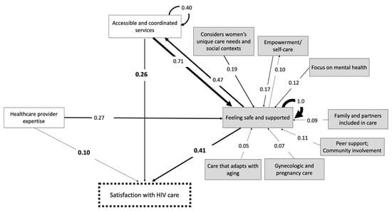 Categories influencing women’s satisfaction with HIV care and their relative category weightings considering direct and indirect pathways.