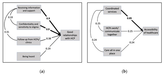 Strong internal dynamics were observed within this category, as depicted in Figure 4b by the self-pointing arrow. These internal dynamics were mainly attributed to the important relationships between four factors: (1) accessibility of healthcare, (2) coordinated healthcare services, (3) having healthcare providers who communicate with each other, and (4) having resources and care located in one place. The most influential factor-level relationship within this category was the effect of coordinated healthcare services on the accessibility of healthcare. Participants discussed the importance of accessibility and coordination to reduce or mitigate barriers to services and treatment.