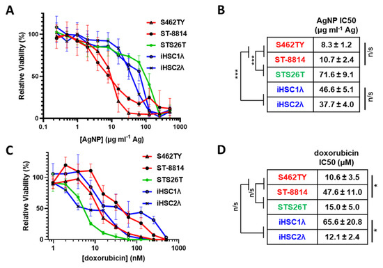 AgNPs show selective cytotoxicity against NF1-null MPNSTs relative to NF1-associated MPNSTs and normal Schwann cells, whereas standard of care doxorubicin does not show selectivity. (A) NF1-associated NF1-null MPNSTs (shown in red; S462TY and ST-8814), sporadic NF1-wildtype MPNST (shown in green; STS26T), and immortalized Schwann cells (shown in blue; iHSC1λ and iHSC2λ) were exposed to AgNPs (25 nm, polyvinylpyrrolidone coated, nanoComposix) for 72 h. (B) IC50 was determined for AgNP, and is shown as μg mL−1 Ag ± SEM. (C) Cells were treated with standard of care chemotherapy doxorubicin for 72 h, and viability was assessed by MTT assay. (D) IC50 of doxorubicin is shown as μM doxorubicin ± SEM. Data represent at least 4 independent experiments per cell line, each containing 5 technical replicates. Significance between and within groups was determined by one-way ANOVA and Student’s t-test, where appropriate (*** p < 0.001, * p < 0.05, n/s not significant).