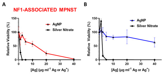 We previously showed that rapid oxidation (activation) of AgNPs into silver ion (Ag+) in triple negative breast cancer is likely responsible for the subtype-selective AgNP-mediated cytotoxic effect [25]. To test the hypothesis that the oxidation into Ag+ in the cell contributes to AgNP selecticity in NF1-associated MPNST, we treated NF1-associated MPNST cells and normal Schwann cells with equivalent silver using AgNP or AgNO3. Silver nitrate was used as a source for Ag+. We found that NF1-associated MPNST (Figure 2A) and normal Schwann cells (Figure 2B) were similarly sensitive to Ag+, but showed differential cytotoxicity with equivalent silver mass in the form of AgNP. These data demonstrate the necessity of the nanoparticle formulation of Ag0 for cancer-selective therapy against NF1-associated MPNST.