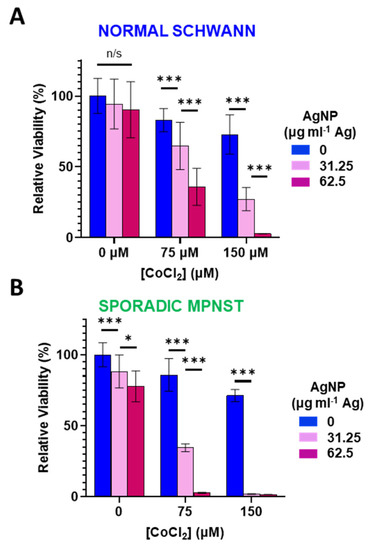 Cobalt chloride-induced hypoxic/oxidative stress sensitizes normal Schwann cells and sporadic NF1-wildtype MPNST to AgNP treatment. (A) Normal Schwann cells (iHSC1λ) or (B) sporadic NF1-wildtype MPNSTs (STS26T) were exposed to CoCl2 and AgNPs for 48 h, and viability was assessed by MTT. Data are shown ± SD and are representative of three independent experiments. Significance between treatments was determined by Student’s t-test (*** p < 0.005, * p < 0.05, n/s not significant).