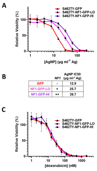 It is critical to further evaluate whether this loss of therapeutic sensitivity is unique to AgNP, or rather a pan-desensitization mediated through global signaling alterations induced by the restoration of functional neurofibromin. Therefore, we treated our cell models (S462TY-GFP, S462TY-NF1-GFP-Lo, S462TY-NF1-GFP-Hi) with standard of care chemotherapy doxorubicin, as described above. All cell derivatives were equally sensitive to doxorubicin (Figure 4C). This finding is particularly intriguing, as the alterations in therapeutic sensitivity after neurofibromin restoration is unique to AgNP, and do not occur in all therapies.