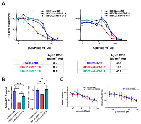 Sporadic MPNSTs arise from a distinct mechanism compared to NF1-associated MPNST and often maintain expression of functional neurofibromin [3]. We next sought to test if we could sensitize NF1-wildtype cells to AgNPs by reducing neurofibromin expression. Thus, sporadic MPNST (STS26T) cells were transduced with neurofibromin-targeting validated short hairpin RNA (shRNA) lentiviral constructs (shNF1-713 and shNF1-714), or non-targeting controls (shNT), sourced from the publicly available RNAi Consortium. Transduced cells were selected with puromycin, and pooled clones were treated with AgNP for 72 h. We found that knockdown of neurofibromin does not alter sensitivity to AgNP in sporadic MPNST (Figure 5A,B). Knockdown was verified by quantitative PCR (Figure 5C). This provides evidence that AgNP would be the most useful in NF1-associated MPNSTs, and likely not effective in sporadic MPNSTs.