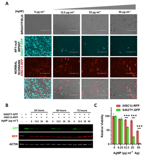 AgNP selectively removes NF1-associated MPNSTs from a co-culture with normal human Schwann cells. NF1-associated MPNST S462TY cells were transfected with a GFP expression vector, normal Schwann cell line iHSCλ1 were transfected with a RFP expression vector, and stable pooled clones were propagated after puromycin selection. iHSC1λ-RFP and S462TY-GFP were seeded at a 1:1 ratio and treated with AgNP (0–50 μg mL−1 Ag) for 0–72 h. (A) Representative images are shown after 72-h treatment with AgNP. (B) Cells treated as indicated were lysed and the protein was subjected to immunoblot assay for GFP, RFP, and actin control. (C) iHSC1λ-RFP and S462TY-GFP monocultures were treated with AgNP for 72 h, and viability was assessed by MTT. *** p < 0.001.