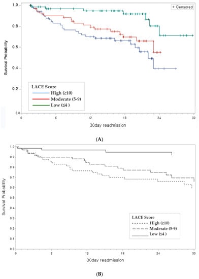 According to the Kaplan–Meier curves illustrated in Figure 3A,B, a LACE score below 4 had a lower readmission likelihood than a moderate (5–9) or high score (>10). The log-rank test showed a statistically significant (p < 0.05) higher likelihood of a 30-day readmission in patients with AMI.