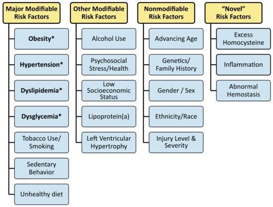 In the US [135], heart disease is the leading cause of death. For people with SCI, cardiovascular disease is a principal concern [10], and it remains the second leading cause of death, following only respiratory disease [10]. Hypertension, hypercholesterinemia, and smoking are key risk factors for the development of heart disease. Still, several other medical conditions and lifestyle choices also place individuals at high risk, including diabetes, overweight/obesity, unhealthy diet, physical inactivity, and excessive alcohol use (Figure 1 and Figure 2). These cardiometabolic and modifiable lifestyle hazards are intensified after SCI, creating a physiological environment that favors cardiovascular risk. Many modifiable risk factors are highly prevalent following SCI, including a current or past history of smoking [136,137,138], poor diet [30], physical inactivity [139,140,141,142], high alcohol consumption [143,144,145], psychosocial and low socioeconomic status [146,147,148,149], and left ventricular structural changes [150,151,152] (Figure 1 and Figure 2). In a prediction model of cardiovascular risk across a median 5.7-year follow-up period, Barton et al. [153] reported that the Framingham Risk Score underestimated the number of cardiovascular disease events [153]. The model did not improve even after the authors added the neurological impairment scale, motor impairment, and level of injury to the model [153].