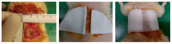 Thirty-six male Sprague-Dawley rats (250–300 g) were purchased from Bio-LASCO Co. Ltd. (Taipei, Taiwan) for use in this study. Rats were randomly divided into four groups (n = 9): control group, lesion control group, chitosan dressing group, and chitosan-AuNPs dressing group. Rats were given a standard diet ad libitum several days prior to the investigation, and were fasted overnight before any procedures. They were placed in individual cages upon arrival and allowed to acclimatize for a minimum of seven days. Animals were pretreated with ketoprofen (4 mg/g) for pain management. On the day of burn injury induction, rats were sedated by intramuscular injection of Zoletil 50 (20 mg/kg; Verbac, France). The rat’s shaved back and skin were scrubbed with povidone-iodine solution. A full-thickness scald burn was induced in rats by means of a brass block with 4 cm diameter [23] after heating it in a boiling solution until the temperature reached 190 °C, as measured by a thermometer. The brass block was then applied onto the rat’s back parallel to the midline for 20 s to produce third-degree burns. Sixty minutes after burning, the wound was either treated with chitosan dressing or chitosan-AuNPs dressing, or left untreated for the lesion control group (Figure 1). The treated wounds were protected with non-stick cotton and fixed with adhesive dressing to prevent dressing tearing. Iodine solution was used daily to disinfect the wounds. After 7 days, the blood from each group was collected, and the rats were euthanized using lethal doses of CO2, followed by burned-skin tissue collection. Skin tissues were fixed for further analysis using 4% paraformaldehyde in PBS.
