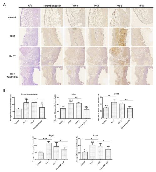 Histological and immunohistochemistry analysis of rat burn wound tissues in the control, lesion, chitosan dressing, and AuNP-coated chitosan dressing groups. (A) Skin tissues stained for H&E, TM, TNF-α, iNOS, Arg-1, and IL-10 markers, respectively; (B) Semi-quantitative analysis of the relative amounts of brown stained-positive cells with all markers amongst all groups. Control = normal control group; BI D7 = lesion control group day 7 post-wounding; Chi D7 = chitosan dressing treatment day 7 post-wounding; Chi + AuNP30 D7 = AuNP-coated chitosan dressing treatment day 7 post-wounding; * p < 0.05, ** p < 0.01, *** p < 0.001.