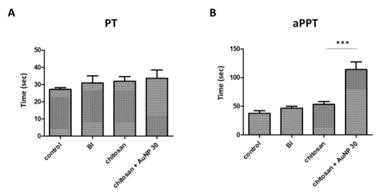 PT and aPTT tests were performed to evaluate the ability of the blood to form clots over time as a function of treatment. We measured the amount and function coagulation factors, which are important for proper blood clot formation. As shown in Figure 5A, there was no significant difference in the PT times among all groups; thus, indicating that both treatments had no significant effect on the extrinsic coagulation pathway in the burn wound. However, the aPTT time results demonstrated that the AuNP-coated chitosan dressing treatment showed the longest time among all groups (Figure 5B), implying its significant influence on the internal coagulation mechanism, which might stimulate the intrinsic coagulation pathway.