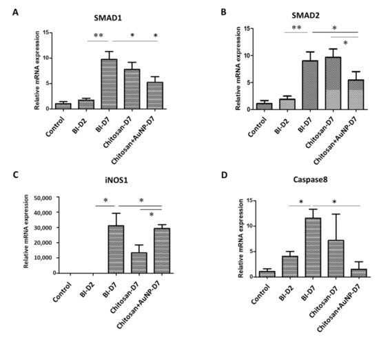 The relative mRNA expression level of several fibrotic biomarkers in rat burn wound tissues from the control, lesion, chitosan dressing, and AuNP-coated chitosan dressing groups. (A) SMAD1; (B) SMAD2; (C) iNOS1; (D) Caspase-8. Control = normal control group; BI D2 = lesion control group day 2 post-wounding; BI D7 = lesion control group day 7 post-wounding; Chi D7 = chitosan dressing treatment day 7 post-wounding; Chi + AuNP30 D7 = AuNP-coated chitosan dressing treatment day 7 post-wounding; * p < 0.05, ** p < 0.01.