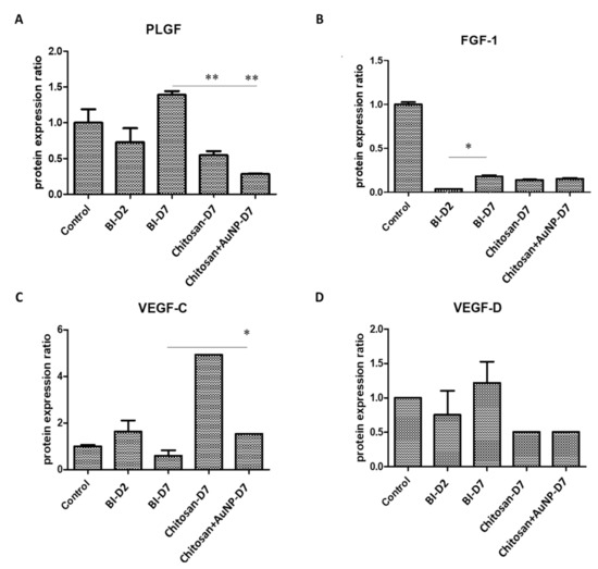 The protein expression of several angiogenesis biomarkers in rat burn wound tissues in the control, lesion, chitosan dressing, and AuNP-coated chitosan dressing groups. (A) FLGF; (B) FGF-1; (C) VEGF-C; (D) VEGF-D. Control = normal control group; BI D2 = lesion control group day 2 post-wounding; BI D7 = lesion control group day 7 post-wounding; Chi D7 = chitosan dressing treatment day 7 post-wounding; Chi + AuNP30 D7 = AuNP-coated chitosan dressing treatment day 7 post-wounding; * p < 0.05, ** p < 0.01.