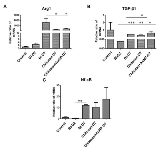 The relative mRNA expression level of several inflammation biomarkers in rat burn wound tissues from the control, lesion, chitosan dressing, and AuNP-coated chitosan dressing groups. (A) Arg1; (B) TGF-β1; (C) Nf-κB. Control = normal control group; BI D2 = lesion control group day 2 post-wounding; BI D7 = lesion control group day 7 post-wounding; Chi D7 = chitosan dressing treatment day 7 post-wounding; Chi + AuNP30 D7 = AuNP-coated chitosan dressing treatment day 7 post-wounding; * p < 0.05, ** p < 0.01, *** p < 0.001.