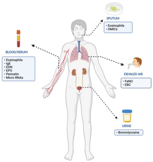 According to the 2016 FDA-NIH Biomarker Working Group, there are different types of biomarkers based on their main clinical application, as described in Table 1 [49]. Th-2 biomarkers such as urinary biomarkers and microRNAs or respiratory biomarkers have been revealed in several clinical trials (Table 2, Figure 1). Furthermore, ongoing research reveals that endotypes of asthma require more in-depth analysis and the use of omics technologies and systems biology [50].
