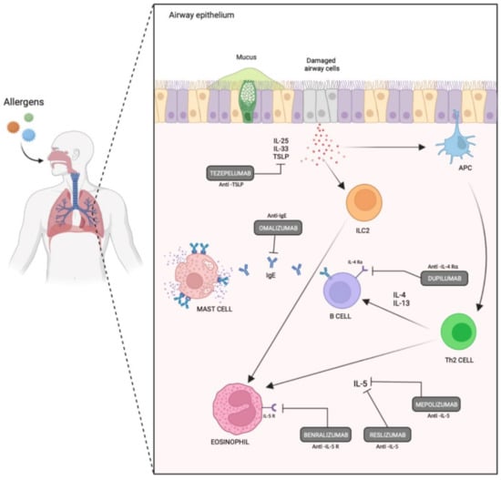 - Cheng, S.L. Molecular Targets for Biological Therapies of Severe Asthma: Focus on Benralizumab and Tezepelumab. Life 2021, 11, 744. [Google Scholar] [CrossRef]
