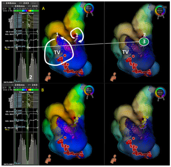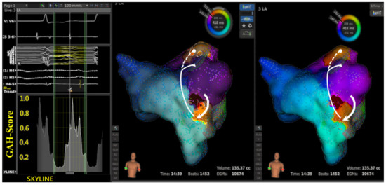 - Latcu, D.G.; Bun, S.S.; Viera, F.; Delassi, T.; El Jamili, M.; Al Amoura, A.; Saoudi, N. Selection of Critical Isthmus in Scar-Related Atrial Tachycardia Using a New Automated Ultrahigh Resolution Mapping System. Circ. Arrhythm. Electrophysiol. 2017, 10, e004510. [Google Scholar] [CrossRef] [PubMed]