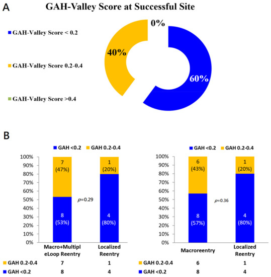 (A) GAH-Valley Score at the Successful Site. (B) Distributions of GAH-Scores in different types of Reentry aAFLs. In the localized reentry, the highlighted area of GAH-Valley scores < 0.2 significantly matched with the successful ablation sites, compared with both macro- and multiple-loop reentry aAFLs (Left). Likewise if excluding the multiple-loop reentry (Right).