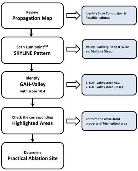 Our major finding is that the aAFL in post-AF ablation or prior surgery in SHD displays multiple deflected SKYLINE patterns and steeper GAH-Valleys. GAH-Valley represents abnormal conduction ‘deceleration’ in the reentry circuit. In the aAFL, such GAH-Valley scores (60%: GAH-scores < 0.2, 100%: GAH-scores < 0.4) were higher than those in the focal AT. In light of this insight from our findings, we proposed a flowchart to identify the potential ablation targets in patients with a complex aAFL in prior AF ablation or cardiac surgery in SHD (Figure 5).