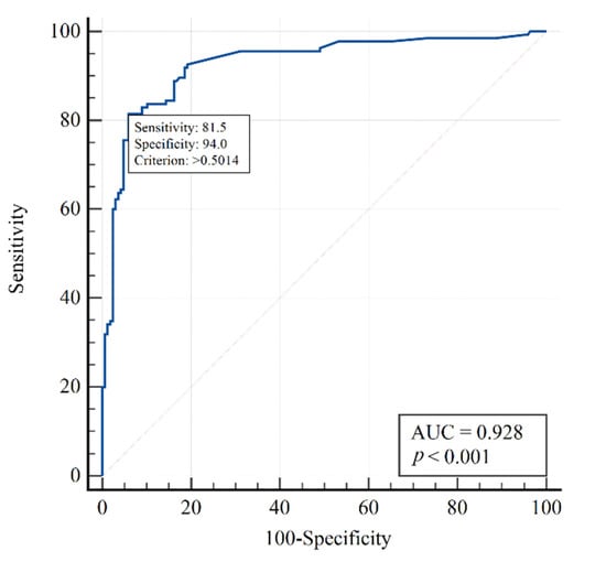 As demonstrated in Figure 1 using the ROC curve, the model based on the selected variables is adequate with AUC = 0.928 (95% CI 0.89–0.95). This indicates a very strong relationship between the risk of death and the selected variables.