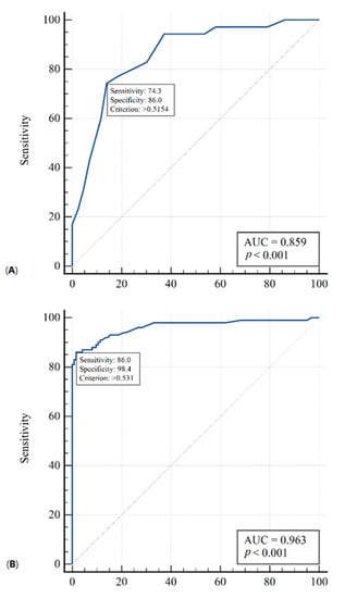 Figure 2. ROC curves (multivariate logistic regression models) for predicting mortality risk. (A): a model using procalcitonin for the Delta group. (B): a five-factor model using IL-6, fibrinogen, leukocytes, thrombocytes, and procalcitonin for the non-Delta group.