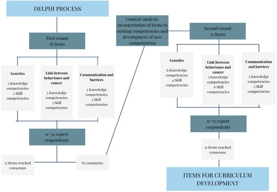 The Delphi method was applied to achieve consensus among a panel of experts about the interventions and knowledge needed to promote healthy behaviours in people at a high risk of cancer [28]. Delphi studies were previously used to plan educational curricula, as using expert clinicians’ opinions for this aim is appropriate [29,30]. The technique requires input from experts in the form of anonymised opinions, which are then subjected to a participatory review of the general results that informs the next round, allowing panellists to reflect and revalidate their decisions [31].