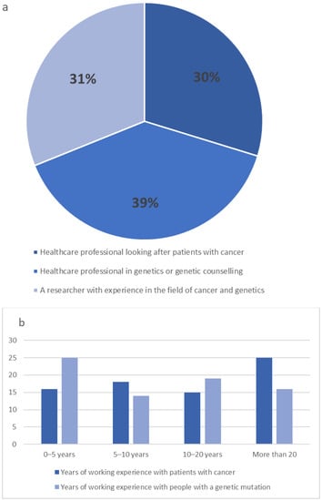 In the first round, 74 experts participated in the Delphi study. All panellists were healthcare professionals from different backgrounds and professions with expertise in both cancer and genetics. Thirty-nine per cent were healthcare professionals working in genetics, 31% were healthcare professionals looking after cancer patients, and 30% were researchers in cancer and genetics (Figure 2a). Panellists were nurses (n = 30), physicians (n = 20), genetic counsellors (n = 9), academics/researchers (n = 10), nutritionists (n = 3), and psychologists (n = 2). Forty-four per cent had more than 20 years of experience (Figure 2b).
