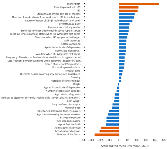 Univariate analysis for endometriosis. A ranked list of attributes (total of 44) associated with endometriosis diagnosis and control groups by the standardized mean difference (SMD). SMD values <−0.2 and >0.2 are colored orange to indicate those with a substantial effect size. The statistics were based on the median calculated for the Q1–Q3 values. An asterisk (*) next to the description of the attribute is the case with a p-value <0.05 for univariate tests of cases and controls (see Methods). For a univariate statistical test and results, see Supplementary Table S1.