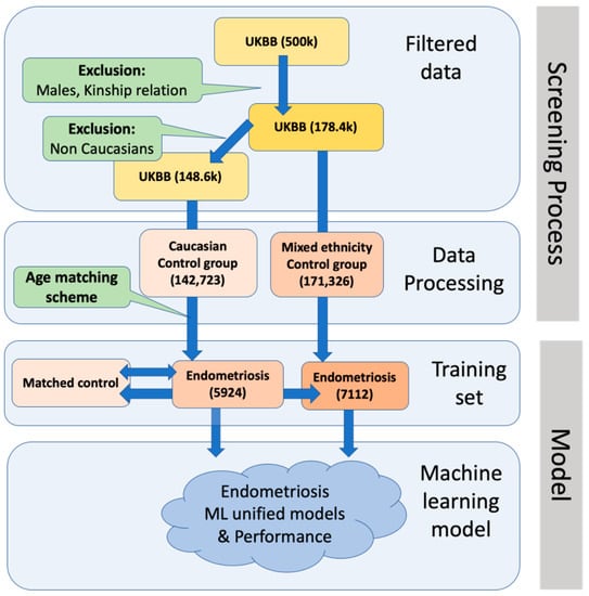 A scheme of data extraction, processing and machine learning models for endometriosis for the Caucasian and the mixed ethnicity populations.