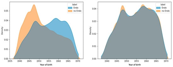 The distribution of the control and endo groups by birth year (Left). Following a protocol for yearly matching schemes, the bias was removed. Additionally, each year a matched proportion of control and endo-groups remained stable throughout (for a detailed protocol, see Supplementary Text S1).
