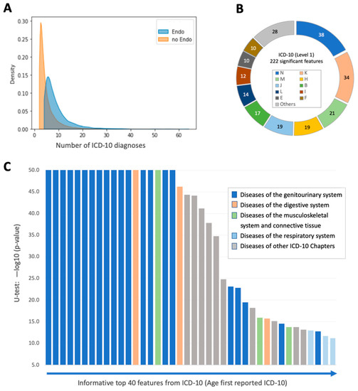 Figure 4C shows a ranked list of the most significant ICD-10 items according to U-test statistical results with pelvic and genital organs that prevail. Specifically, the most significant ICD-10 items included N73 (pelvic inflammatory diseases), N81 (female genital prolapse), noninflammatory disorders of the ovary, fallopian tube, and broad ligament (N83) and of the uterus, except cervix (N85), polyps of the female genital tract (N84), and excessive, frequent, and irregular menstruation (N92). Endometriosis knowledge confirms the importance of diseases associated with N, K, and M, as well as, to a lesser extent, diseases of the respiratory system (J).